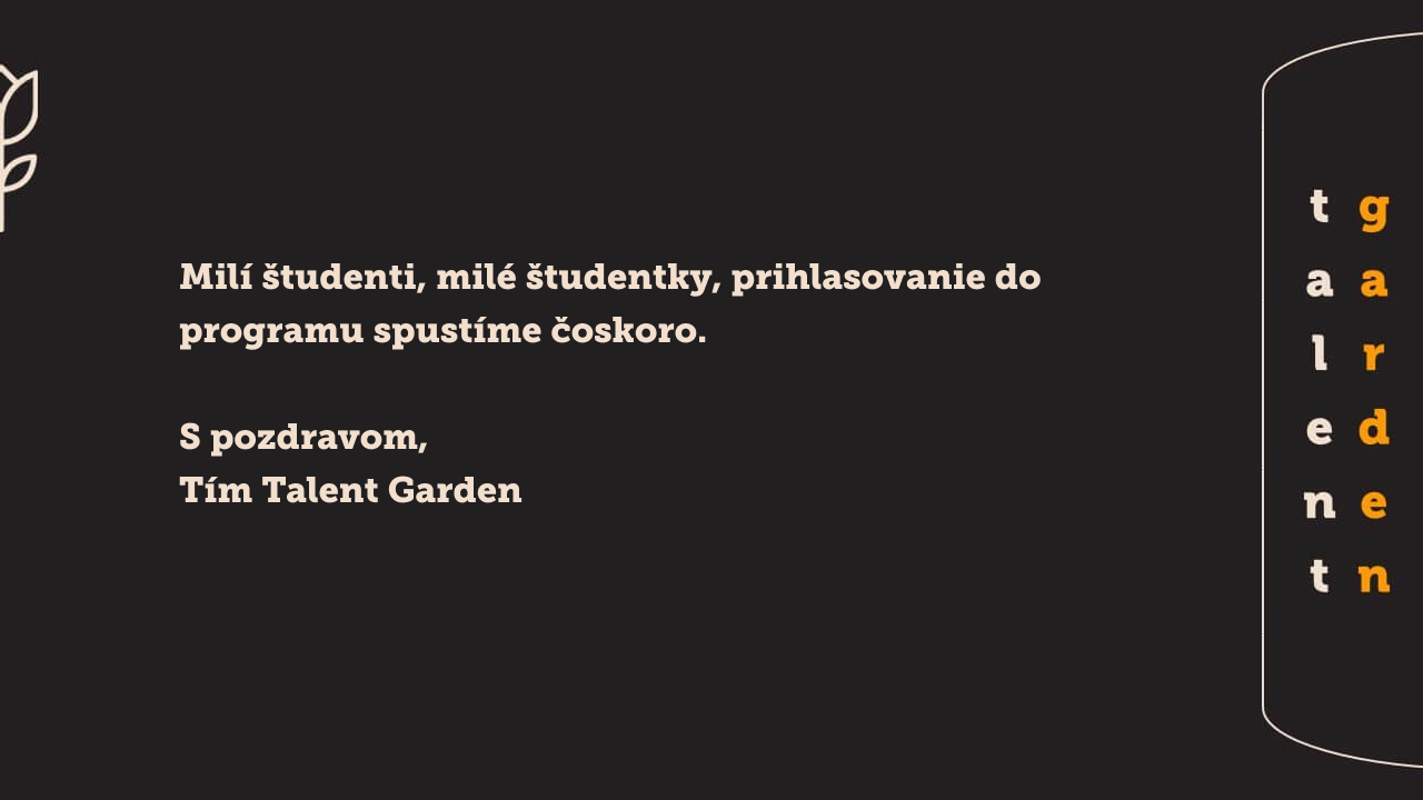 Vyplň nám prihlasovací formulár, ktorý nájdeš o kúsok nižšie a pošli nám tvoje kreatívne predstavenie na talentgarden@netherlandschamber.sk Tvoje predstavenie môže mať formu interaktívnej prezentácie, videa, alebo si vyber akúkoľvek inú formu, ktorá zaujme. V tvojom predstavení by nemalo chýbať: niečo o tebe/prečo si sa rozhodol prihlásiť/aká je tvoja super schopnosť/čo považuješ doteraz za svoj najväčší úspech/aké sú tvoje záujmy mimo školy